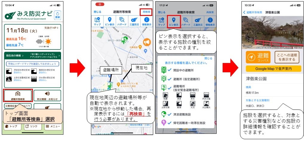 「みえ防災ナビ」では、スマートフォンの位置情報に基づき、現在地周辺の避難場所等について地図で確認することができます。