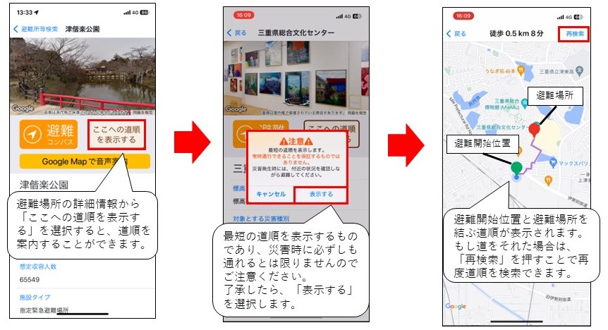 ただし、あくまで避難開始位置から避難場所などへの最短経路を表示しているものであり、実際の災害状況を考慮しているものではありませんので、周囲の状況をよくご確認のうえご利用ください。