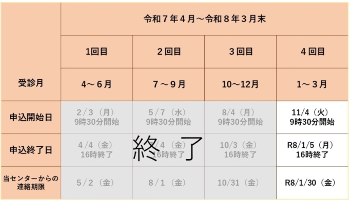 ・4回目(受診月:令和8年1月~3月)の申込みは令和7年11月4日(火)に開始します。