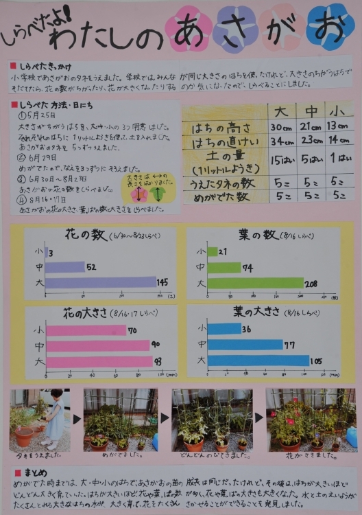 はちが大きいほど、花や葉っぱの数がおおくて、大きさも大きくなりました。