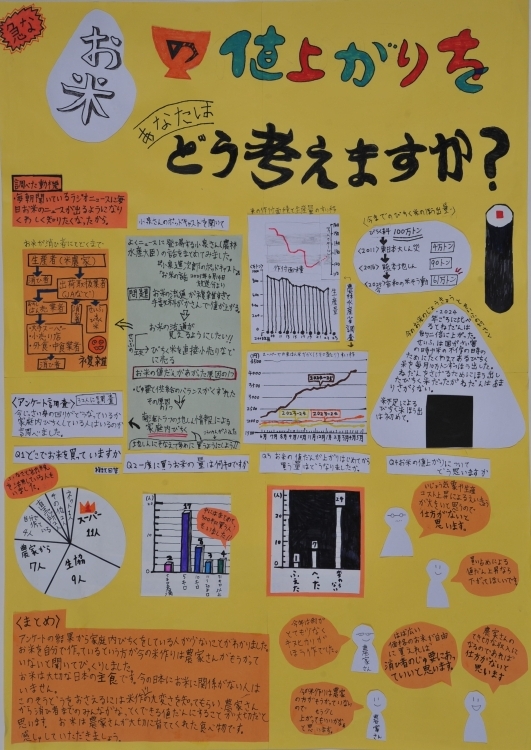 僕は夏休みに、以前田植えをさせてもらった農家さんの家に泊めてもらい、お米について話を聞きました。前からお米の値上がりなどをニュースで聞いていたのもあり、このテーマについて調べることにしました。様々な意見を聞きたかったのでアンケートを取ったり、農林水産大臣の小泉さんのラジオを聴きました。結果、値段が上がっている理由で考えられるのは需要と供給のバランスが崩れたということです。今必要なのは、農家さんが米作りを続けられる値段でお米を売り、消費者がそれに納得できる仕組みを作ることだと思います。少子化や高齢化が進む中でもお米が大切にされていってほしいです。これからも日本の主食がお米であり続けますように。
