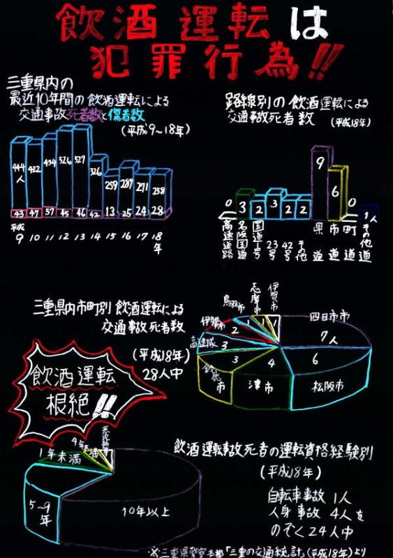 僕は「飲酒運転は犯罪行為」というみだしで、統計グラフコンクールに応募したのは、去年の夏に福岡で発生した飲酒運転による死亡事故から1年がたち、僕もこの悲しいニュースを知り、飲酒運転に対して怒りを持ったからです。どの資料を活用し、どのように表現することが、三重県の飲酒運転の実態をわかりやすく示すことができるのか悩みました。そのため、棒グラフがいいのか、円グラフがいいのか迷うこともありましたが、工夫して色別に表現してみました。この作品を少しでも多くの人に見てもらい、飲酒運転がなくなることに役立てればいいなあと思います。