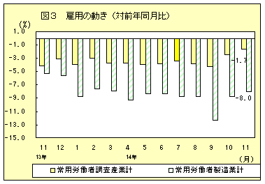 3 雇用の動き「常用雇用指数(調査産業計)」は、93.9と前年同月比1.7%減でした。この内、「製造業の常用雇用指数」は、87.0と前年同月比8.0%減でした。 一方、全国平均(平成14年11月分確報)の「製造業の常用雇用指数」は、92.9と前年同月比3.9%減でした。