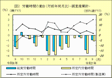 2 労働時間の動き(事業所規模5人以上)「総実労働時間」は、対前年同月比0.9%減の134.4時間「総実労働時間」は134.4時間で対前年同月比0.9%減、「所定内労働時間」は123.7時間で対前年同月比1.1%減、「所定外労働時間」は10.7時間で対前年同月比1.9%増でした。このうち、「製造業の所定外労働時間」は16.6時間で対前年同月比15.3%増でした。