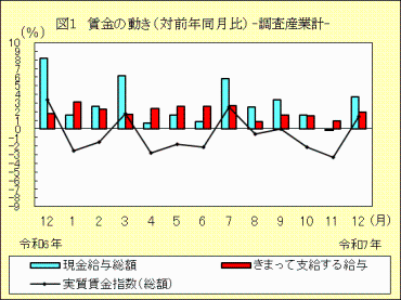 1 賃金の動き(事業所規模5人以上)「きまって支給する給与」は、対前年同月比1.9%増の275,782円「きまって支給する給与」は275,782円で対前年同月比1.9%増、賞与など「特別に支払われた給与」を合わせた「現金給与総額」は608,997円で対前年同月比3.7%増でした。また、「実質賃金指数(総額)」は172.6で対前年同月比1.4%増でした。