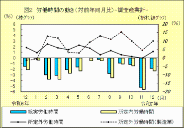 2 労働時間の動き(事業所規模5人以上)「総実労働時間」は、対前年同月比1.9%減の133.6時間「総実労働時間」は133.6時間で対前年同月比1.9%減、「所定内労働時間」は122.7時間で対前年同月比2.3%減、「所定外労働時間」は10.9時間で対前年同月比3.8%増でした。このうち、「製造業の所定外労働時間」は16.2時間で対前年同月比10.1%増でした。