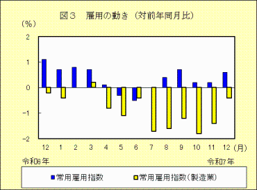 3 雇用の動き(事業所規模5人以上)「常用雇用指数」は、対前年同月比0.6%増の105.7「常用雇用指数」は105.7で対前年同月比0.6%増でした。このうち、「製造業の常用雇用指数」は97.0で対前年同月比0.4%減でした。