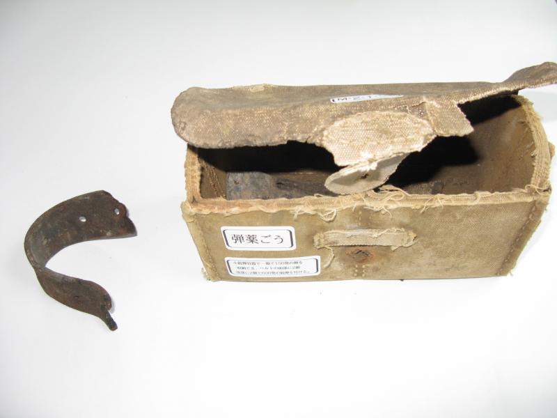 | 概要 | 皮製の小銃弾容器。1箱に150発の小銃弾を収納できるものをベルトの前部に2個、後部に2個つけて600発の銃弾を身につけていた。かなりの重さであったと思われる。サイパン遺骨収集で収集。 |