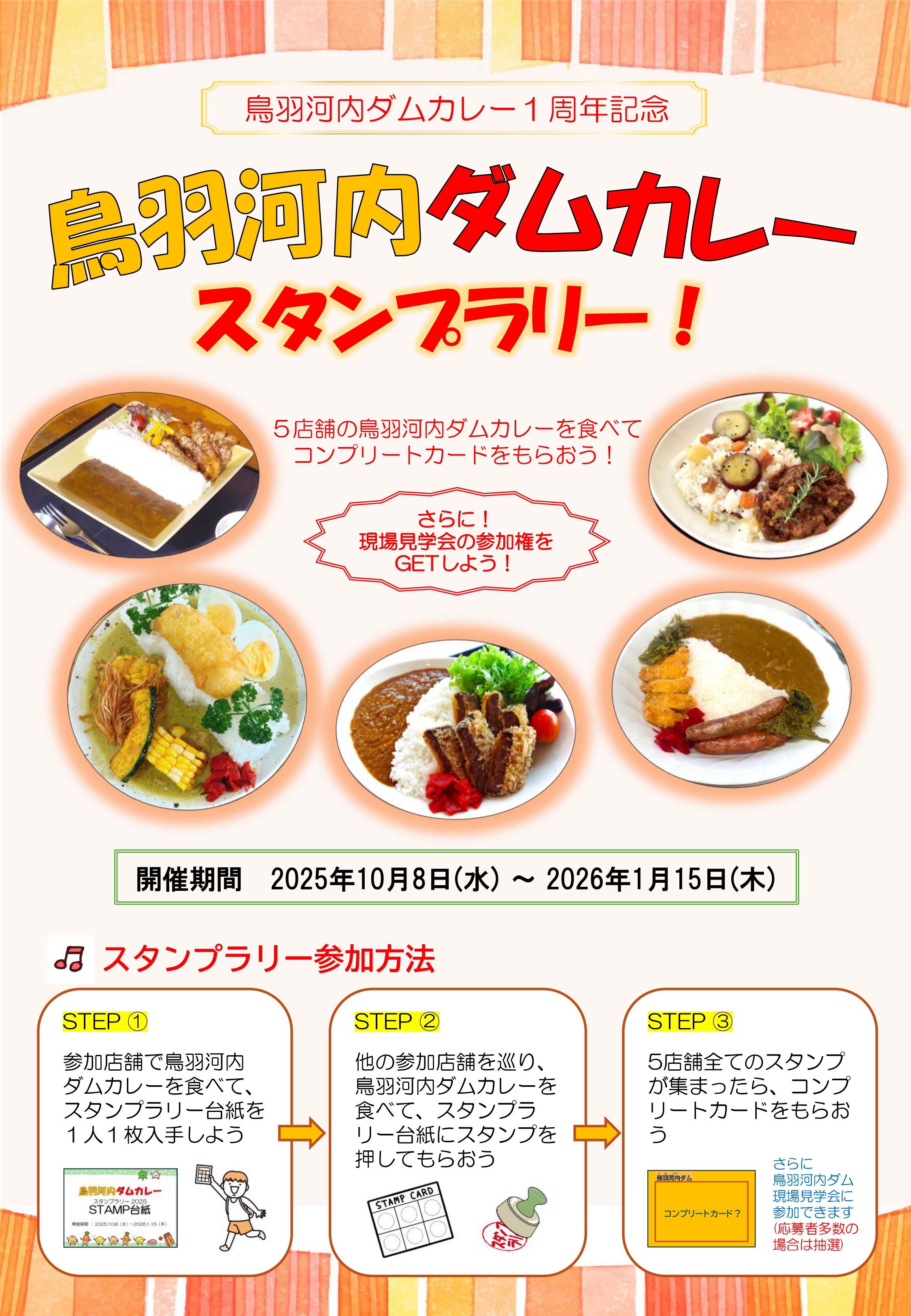 鳥羽河内ダムカレーが令和7年10月8日で提供開始1周年を迎えるにあたり、「鳥羽河内ダムカレー提供開始1周年記念スタンプラリー」を開催中です。詳細は詳細情報HPをご確認ください。1. スタンプラリー開催期間