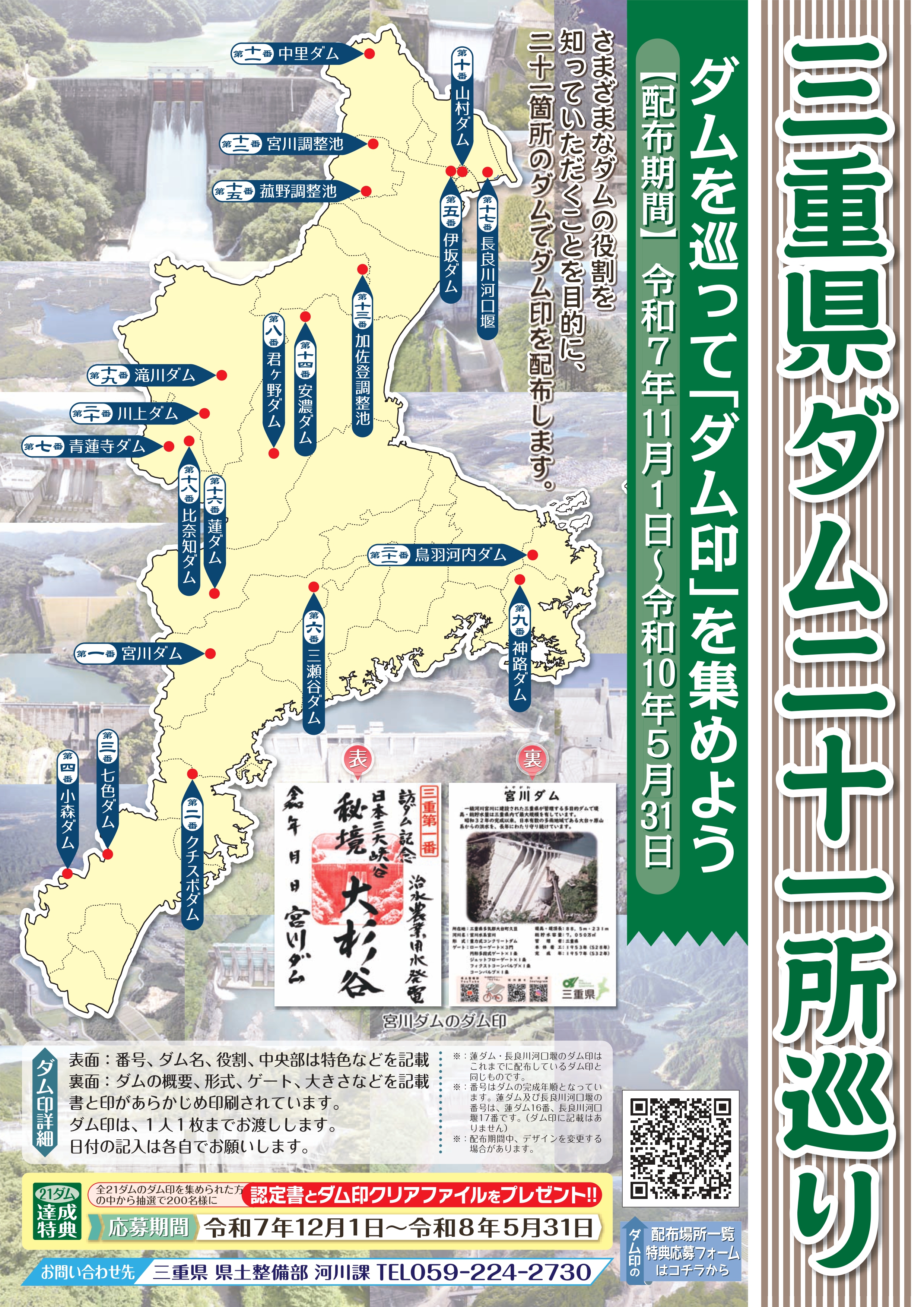 令和7年11月1日から、三重県内にある様々なダムの役割を知っていただくことや、地域の観光振興を目的として、「ダム印」を配布する「三重県ダム二十一所巡り」を開催します。詳細は詳細情報HPをご確認ください。1. 開催期間