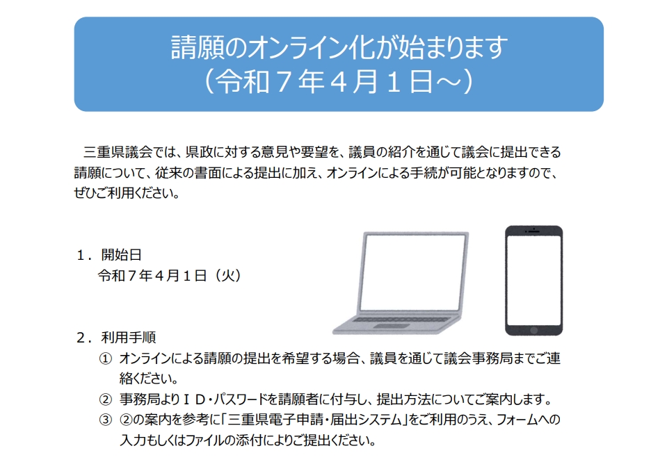 令和6年度に協議を重ねた結果、実施に向けた環境が整ったことから、令和7年4月から請願のオンライン化の運用を開始しました。