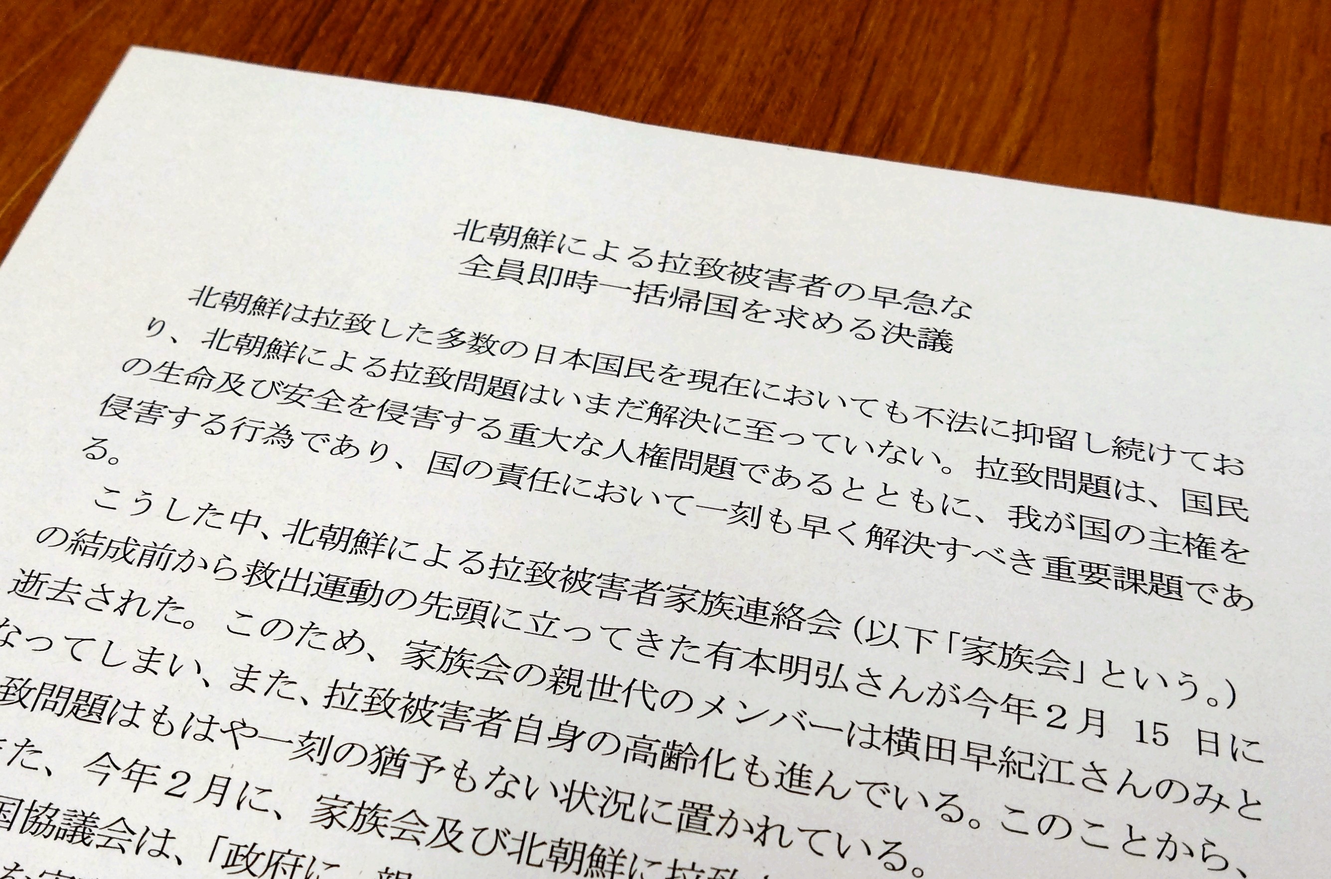 この決議案では、北朝鮮に対し、一日も早く拉致被害者全員を帰国させるよう強く求めるとともに、政府および国会において、全拉致被害者の即時一括帰国の早急な実現のために全力を尽くして取り組むよう要望しています。
