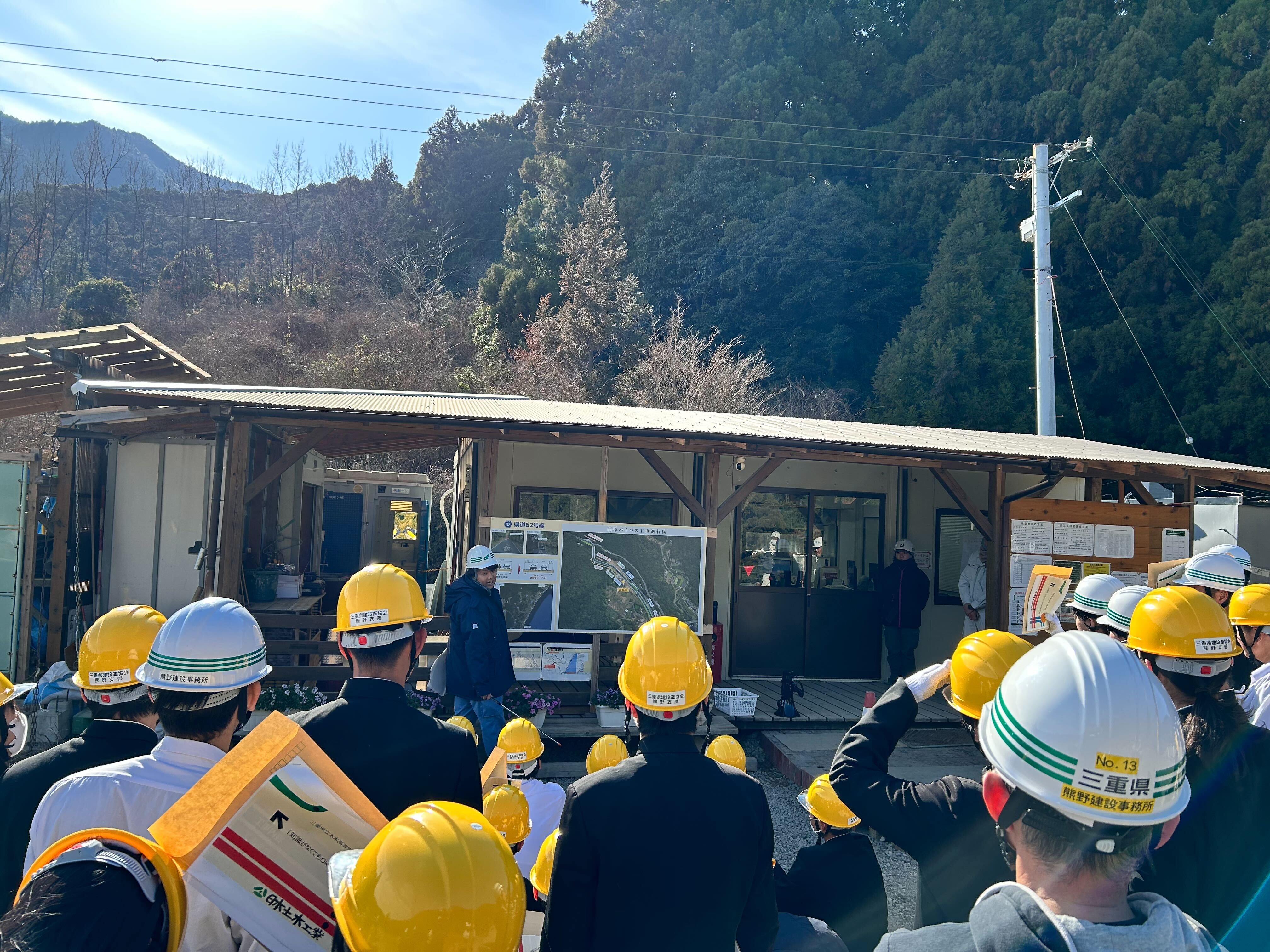 三重県建設業協会の主催により、主要地方道御浜紀和線(西原バイパス)道路改良工事(受注者:日本土木工業株式会社)現場において、三重県立木本高等学校の2年生を対象に現場見学会を開催しました。