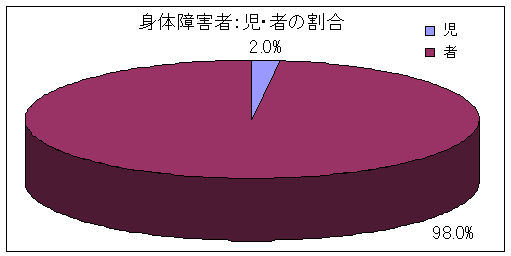 平成18年4月現在、三重県における身体障害者数は、68,491名で、18歳以上(以下「者」とする)は67,117名(98.0%)、18歳未満(以下「児」とする)は1,374名(2.0%)でした。