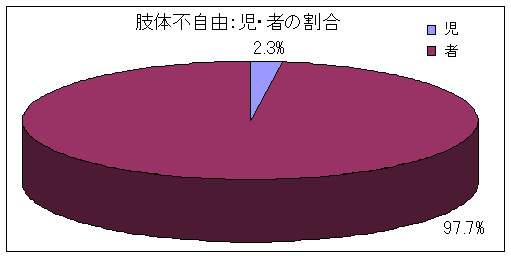 このうち「肢体不自由」は38,482名で、全身体障害者の56.2%でした。「肢体不自由」のうち「肢体不自由者」は37,600名(97.7%)、「肢体不自由児」は882名(2.3%)であり、いずれも「児」の占める割合は2%程度でした。