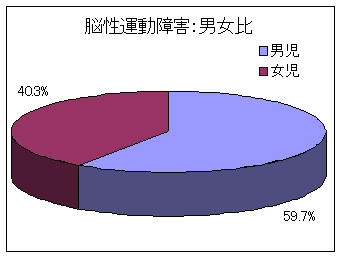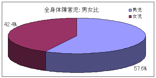 全身体障害児における男女比では、男児57.6%、女児42.4%と男児に若干多くみられていました。