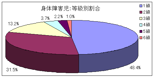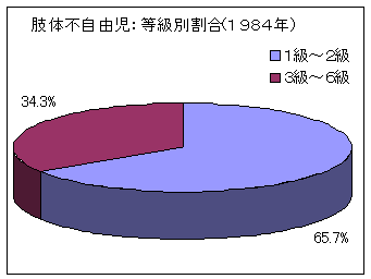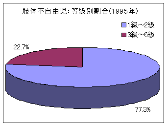 肢体不自由児の等級別割合では、前述のように1級から2級の重度障害児が79.9%とほぼ80%を占めていましたが、昭和59年(1984年)では65.7%、平成7年(1995年)では77.3%であり、20年前と比較して明らかに障害程度が重度の手帳を所持している肢体不自由児が増加しています。