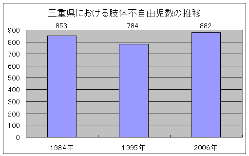 三重県内の身体障害児とくに当施設の専門領域である肢体不自由児の動向について、平成18年(2006年)現在の身体障害者手帳所有状況をもとに調査しました。当施設において、昭和59年(1984年)、平成7年(1995年)にも同様の調査を行っていますので、約10年ごとの変化についても比較・検討し言及しました。ただ、最近は個人情報保護条例などの法規制などにより、詳細な情報の収集が困難なことから、充分な比較・検討ができない事項も少なからずありましたが、出来る限り分析を行い、グラフを中心に報告しました。