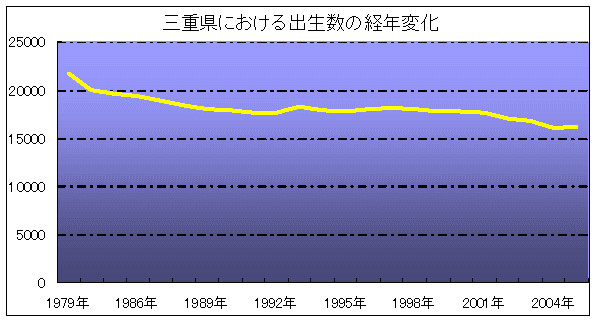 参考に三重県における出生数の経年変化を下図に示しますが、明らかに減少傾向が続いています。2005年には出生数が16,120名となっており、脳性麻痺の発生が出生1,000に対し2名程度と言われていることから、最近の三重県における1年間の脳性麻痺児の出生数は、30名程度と推定されます。