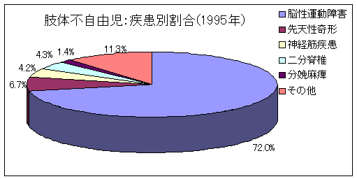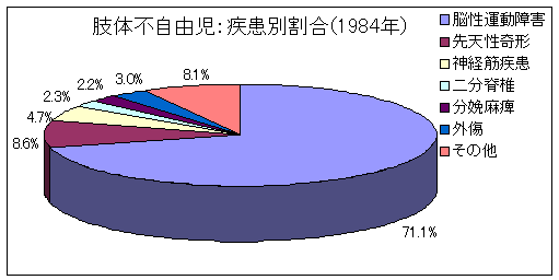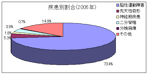 昭和59年(1984年)、平成7年(1995年)との比較では、二分脊椎児の占める割合が20年前と比較し若干増加傾向がみられている以外、疾患別割合にはほとんど変化がみられず、脳性運動障害が70%以上を占めています。