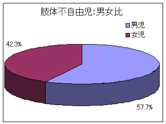 肢体不自由児の男女比では、全身体障害児における男女比とほぼ同様の傾向を示し、男児57.7%、女児42.3%と男児に若干多くなっていました |
