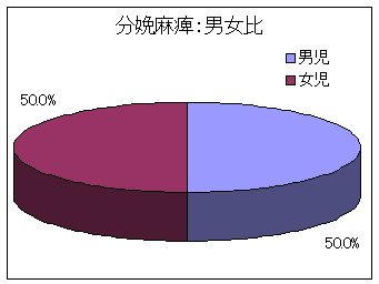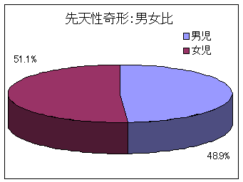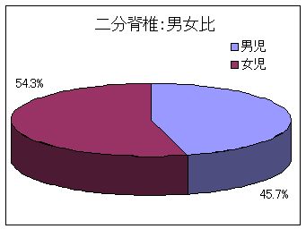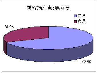 その他の疾患別の男女比では、脳性運動障害においては、男児にやや多く、全肢体不自由児とほぼ同様の傾向を示していました。筋ジストロフィー症などが多くを占める神経筋疾患においては男児が約70%と多くみられていますが、先手性奇形や二分脊椎では若干女児に多い傾向がみられており、分娩麻痺での男女比はほぼ同じでした。