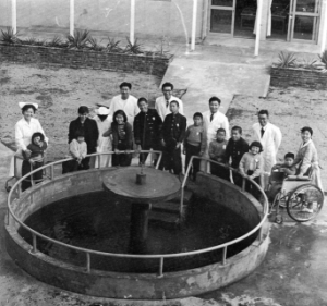 当施設は、昭和32年に児童福祉法および医療法に基づく県立・県営の肢体不自由児施設「三重県立草の実学園」として現在地である津市城山に開設されました。開設当初の病床数は54床でしたが、入所児数が増加してきたため、昭和37年に84床、昭和38年に104床、昭和41年には110床と増床するとともに増築され、昭和54年には全面改築が行われました。しかし、この頃から全国的にも入所児数の減少傾向がみられ、当施設においても同様の傾向がみられたことから、平成9年に病棟および診療の業務内容や勤務体制などの見直しを行い、平成10年4月に病床定数の削減(60床)や職員の減員を行い、重症心身障害児通園事業などの新規事業を開始するための職員の増員を行うとともに、名称を「三重県立草の実リハビリテーションセンター」と変更しました。