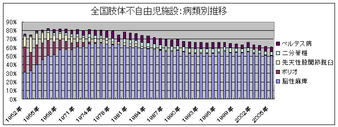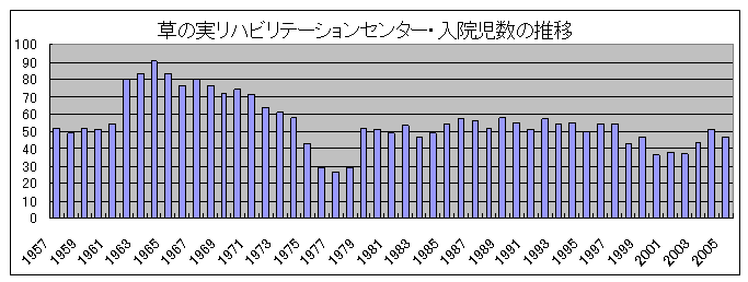 ところで、全国の肢体不自由児施設実態調査によれば、当初は脳性麻痺、ポリオ、先天性股関節脱臼の占める割合が比較的高く、施設の3大疾患と呼ばれていましたが、ポリオや先天性股関節脱臼は予防医学および治療などの進歩によって激減してきました。それに反して、脳性麻痺児の占める割合が増加しており、その他、当施設と同様に二分脊椎児やペルテス病児の入所比率が増加傾向にあります。