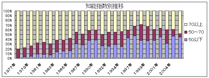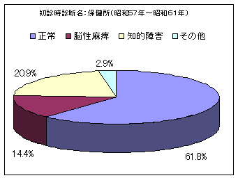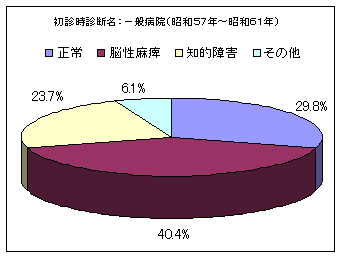 当時は、脳性運動障害児の早期発見・早期治療が強く叫ばれ、ボバース法、ボイタ法、上田法、感覚統合療法など、脳性運動障害などに対する特殊な治療方法がほとんどの療育機関で取り入れられ、とくにボイタ法では早期に治療すれば正常化するとの情報が盛んに出回った時期でもありました。保健所からの紹介児の約60%は正常と診断されていますが、これは見逃しが過剰に懸念されたことも大きな要因と思われます。 |