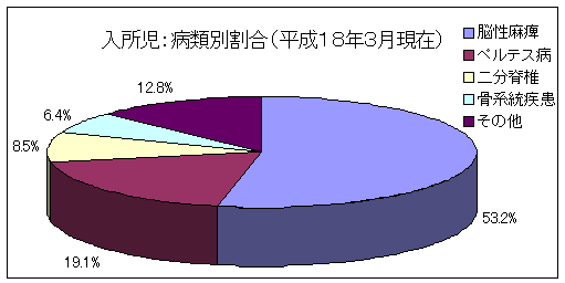 入所児の病類別割合に関しては、平成18年3月現在では、脳性麻痺児が50%強を占め最も多く、次いでペルテス病、二分脊椎、骨系統疾患(先天性奇形)となっており、とくにペルテス病の入所児数の増加が顕著となっています。