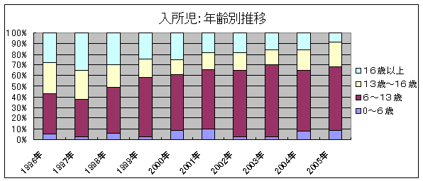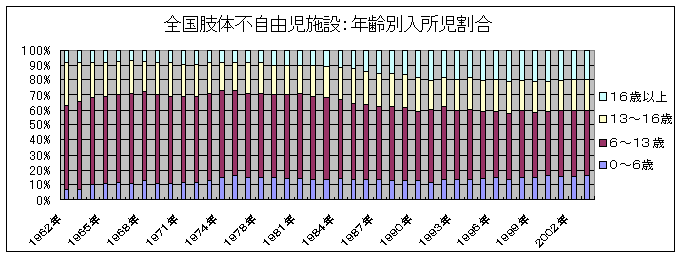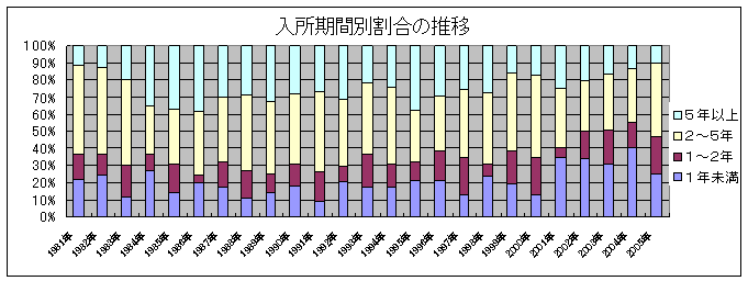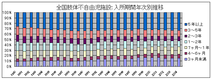 入所期間の推移に関しては、1年未満の短期間の入所の割合がやや増加しているようですが、全国の肢体不自由児施設事態調査でも、3ヶ月間から6ヶ月間程度の入所割合が増加傾向を示しています。これは、手術後のリハビリテーションを目的とした数ヶ月から半年間程度の短期間の入所児が増加してきていることによることが大きな要因と思われます。