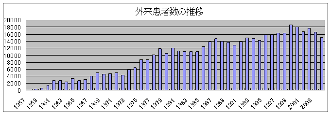 外来診療では、とくに脳性麻痺、精神発達遅滞などの中枢神経障害児の治療に重点をおき、乳幼児期からPT、OT、ST、発達療育(障害児保育・DT)などを施行しています。開設当初は、外来診察はほとんど行われておらず、主として県内各地の児童相談所などから入所対象として紹介されてきた障害児を受け入れていたようです。その後、徐々に外来診療を始め、さまざまな障害児や発達障害が疑われるこどもさん達が、県内各地の保健所や医療機関から紹介されてくるようになり、外来受診患者数も増加してきました。