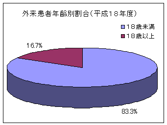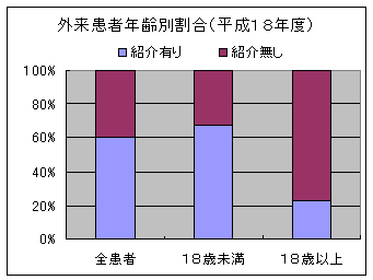 外来受診患者の多くは、18歳未満であり、全外来患者の80%以上を占めています。また、県内各地の医療機関や保健所などからの紹介が多く、紹介率は全患者では、約60%、18歳未満に限れば約70%となっています。
