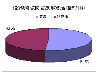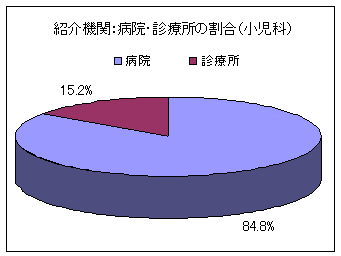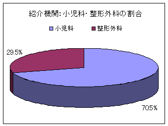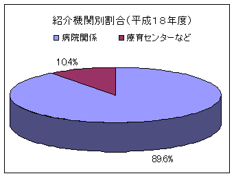 紹介機関については、平成18年度では、病院など医療機関からの紹介が約90%であり、残りの約10%が県内の療育センター、保健所などからの紹介となっています。医療機関では、ほとんどが小児科・整形外科関連の病院・医院からの紹介であり、小児科が約70%、整形外科が約30%となっています。