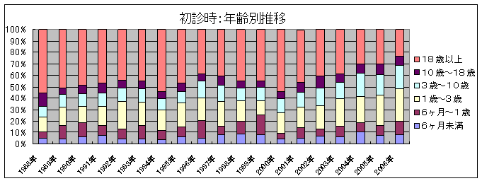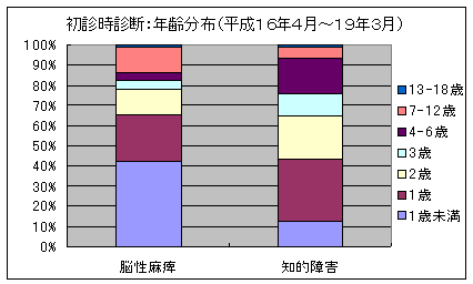 平成16年〜平成19年における脳性麻痺児の初診時年齢は、1歳未満が約40%であり、80%以上が3歳未満で受診しています。知的障害児の初診時年齢は、脳性麻痺に比較してやや高くはなっているものの、やはり80%近くが3歳未満で受診しています。 |