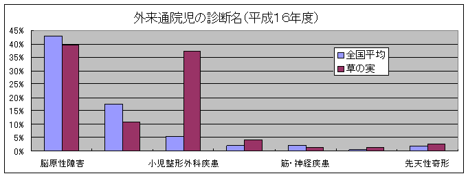 外来患者の診断名では、全国の肢体不自由児施設と同様、脳性運動障害や知的障害が大半を占めていますが、当施設では、小児整形外科疾患児や骨系統疾患を含む先天性奇形児の受診割合が、全国の他の施設よりもかなり多くみられていることが特徴のひとつと言えるようです。