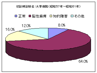 ちなみに当時の大学病院・一般病院から紹介された受診児の初診時診断名の割合を以下に示しますが、頭部のCT、MRIや脳波検査などの施行はもちろん小児科医師を中心に診断された結果でもあり、当然のことながら正常児より脳性麻痺児、知的障害児などの占める割合が多くなっています。