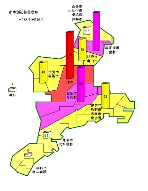 外来患者は、三重県内各地から受診しています。受診者数としては、当施設が津市にあるからと思われますが、中勢部を中心に多く、北勢、南勢、紀南地域からの受診が少ないようです。とくに人口比でみると桑名・いなべなど北勢地域と熊野市以南の紀南地域からの受診率が非常に低いようです。
