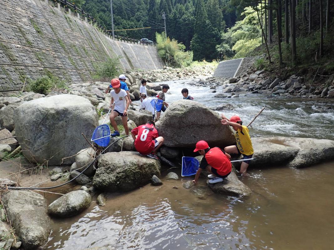 7月21日、子どもたちが川の生き物調査を実施しました。調査を実施したのは、 松阪市立豊地小学校5年生。学区を流れる中村川の上流、宇気郷地区で川に住む生き物を採取し、観察しました。川遊びが得意でない子もいましたが、次第に慣れて、いろいろな生き物を採ることができました。