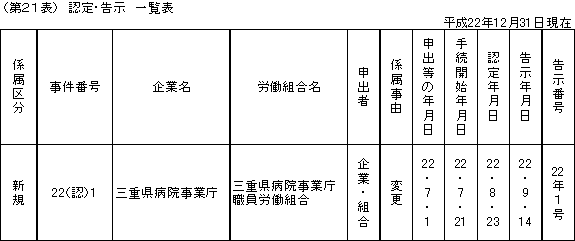 平成22年における取扱件数は、新規申請1件があり、新規申請の1件は、三重県病院事業庁から組織変更による一部変更認定の申出がなされたものでした。