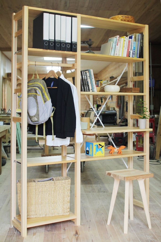 熊野産のヒノキ材を使った木製システム家具「イキクッカヒノキ」を使った学習机ユニットです。ドライバー1本で組み立てができ、組んだ後からでも棚板、デスク、ハンガー掛けは位置を簡単に移動させることができます。シンプルな本棚からデスクそして洋服掛けへ、子供の成長や使い勝手に合わせて自分の好きな形にカスタマイズできます。イキクッカはフィンランド語で「永遠に咲き続ける花」という意味です。
