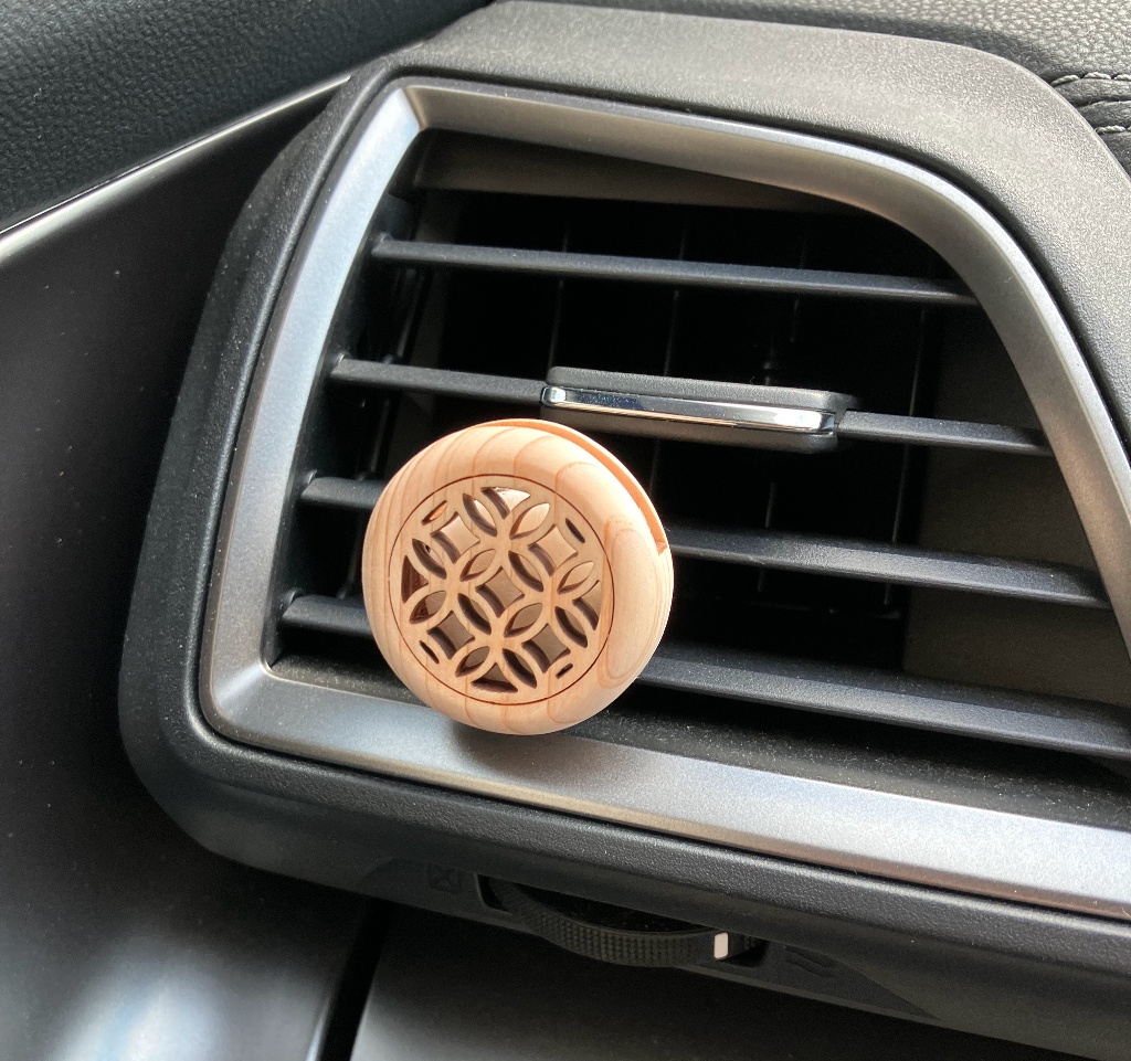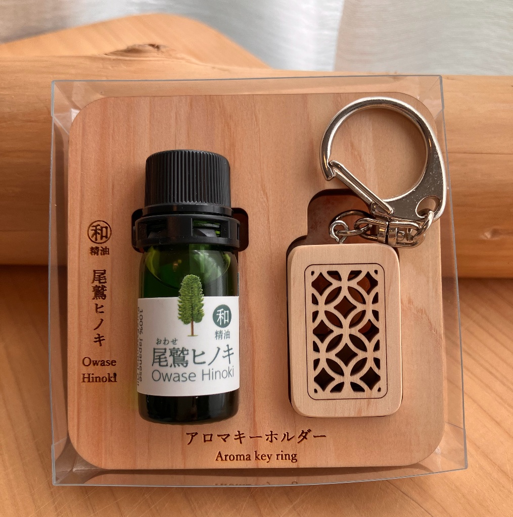 尾鷲ヒノキの精油と、同材を用いたアロマディフューザーのセットです。内蔵のコットンに精油を垂らすことで、車用ディフューザーはエアコンの風に香りをのせ、アロマキーホルダーは持ち歩きながら香りを楽しめます。伝統的な文様である七宝文様をレーザー彫刻することで和の雰囲気に仕上げています。評価のポイント