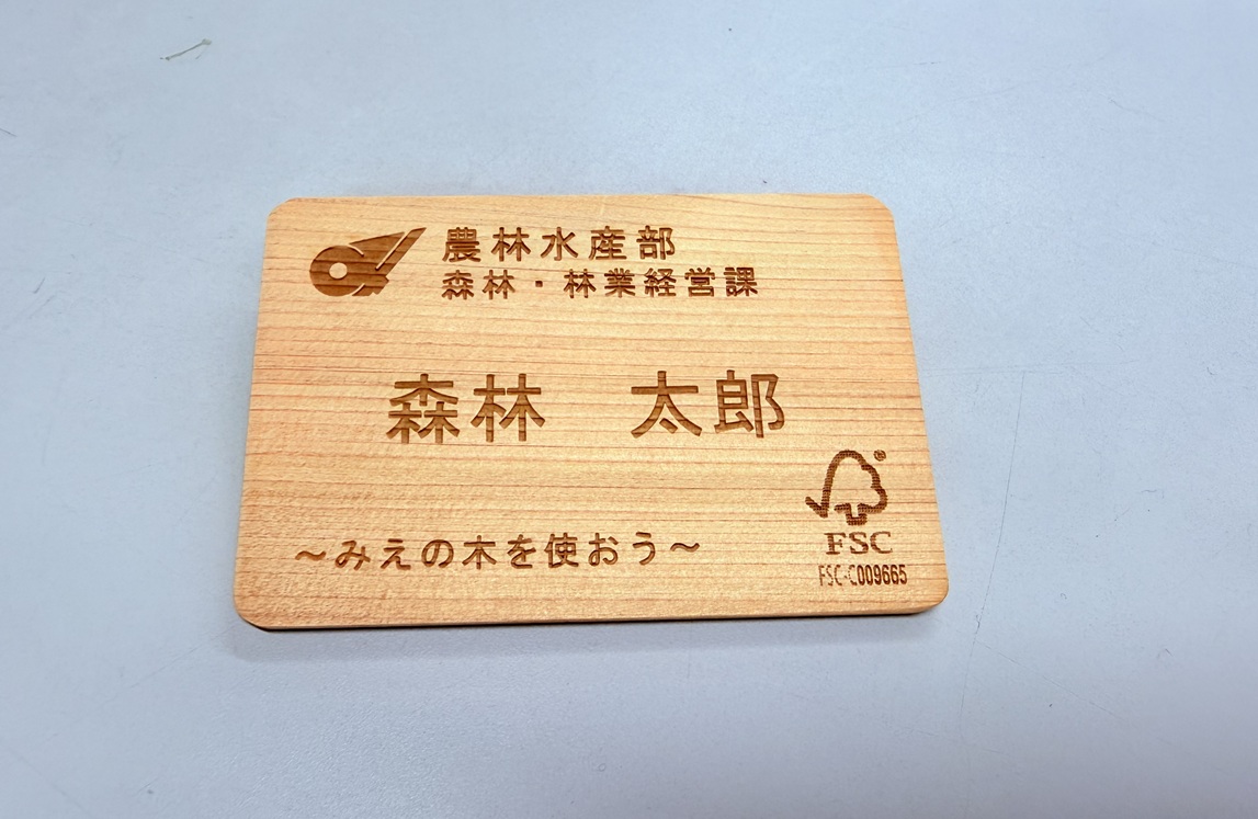 尾鷲ヒノキを使用した名札です。レーザー加工により社名、ロゴ、氏名などのご要望に対応可能です。