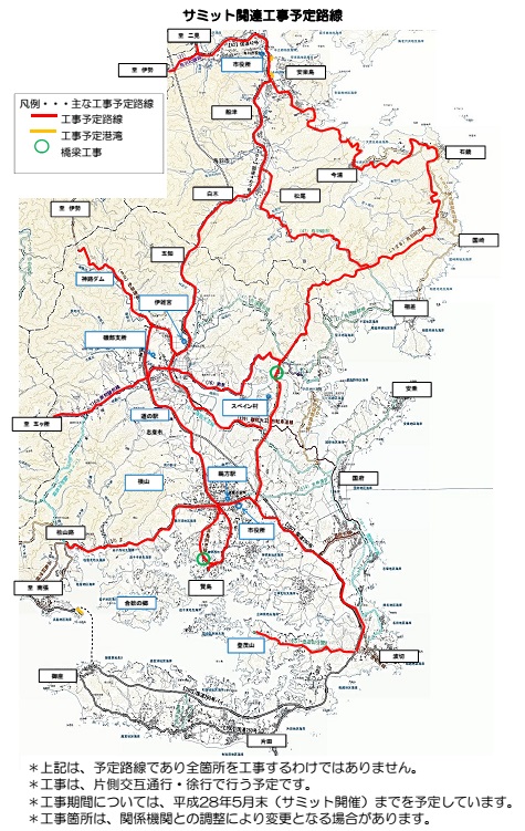 平成28年5月26日~27日に「伊勢志摩サミット」が開催されることから、交通量の増加等が想定され、これまで以上に安全対策等を行っていく必要があります。主な対策として、道路舗装の修繕、ガードレール・側溝などの道路施設の補修や更新、除草や伐木、清掃等の工事実施を予定しているところです。