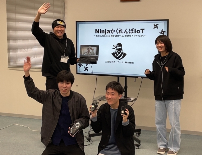 当日は、審査員による投票に加え、見学者を含む Zoom ミーティング参加者による人気投票を行い、今年度のグランプリ作品は、三重代表チームが制作した「Ninja かくれんぼ IoT」に決定しました。グランプリを受賞されたチーム shinobi の皆さんには、総務省国際戦略局賞が授与されます。