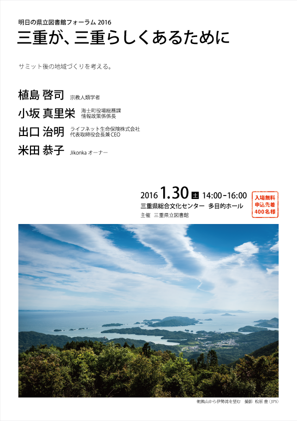 ゲストに聖地研究の第一人者で伊勢や熊野の信仰文化についても詳しい植島啓司氏のほか、三重県ご出身の方々をお迎えし、これからの三重の地域づくりについてお話しいただきます。