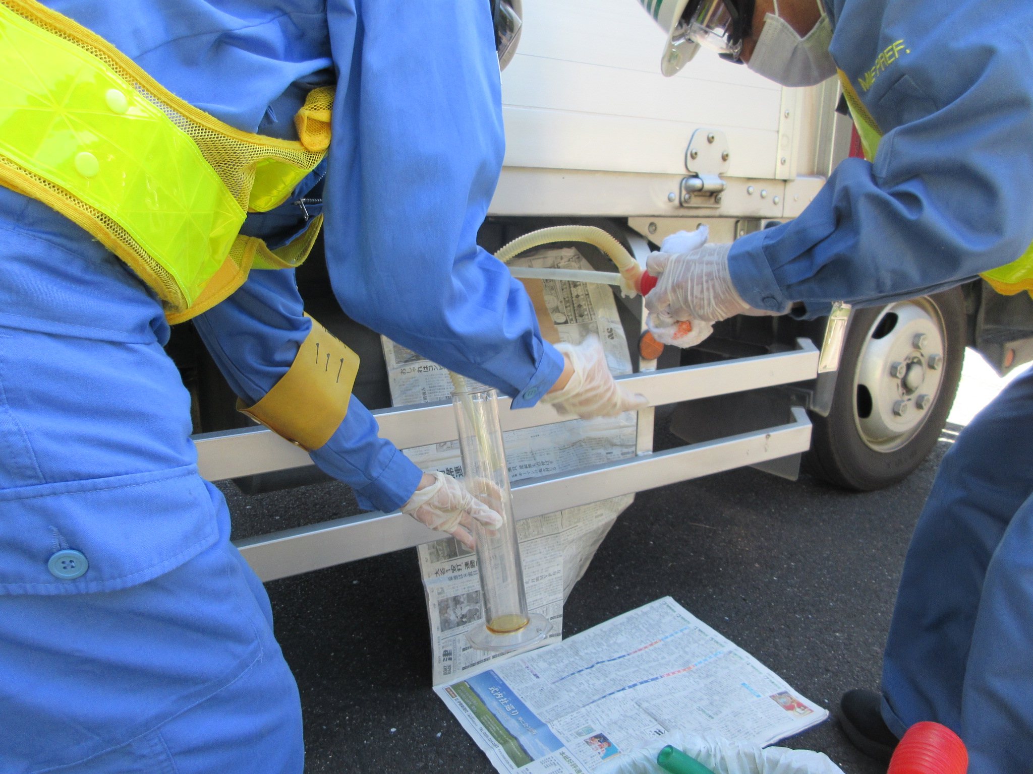 軽油引取税の脱税に繋がる不正軽油の調査の一環として、各県税事務所の管内で随時実施しているもので、公道を走行する大型トラック等から燃料を採取して分析を行い、不正軽油の使用・流通の有無を確認するとともに、適正な軽油の流通確保に努めています。