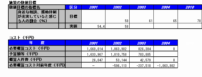 ※ 2002年度の実績値は、2002年11月現在の見込み値です。 ・県民が生活していく上において必要となる相談や援助が、身近なところで受けることができると感じる人の割合です。(県民意識基礎調査) ・地域におけるささえあいの体制の確立度合いを総合的にあらわすと考え、選定しました。 ・県民意識基礎調査において、緊急度が高いため、2006年度までは毎年3.5%アップ、2007年度からは1.5%アップと算出しました。 |