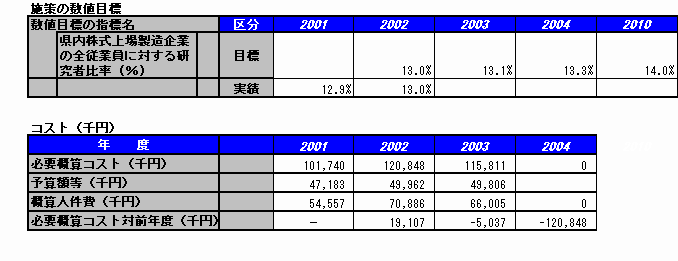 ・研究者比率は、県内に本社を置く株式上場企業(製造業)の全従業員数に対する研究開発担当者数の割合です。 ・2003年度の目標値は、過去(5年間)の全国研究者比率の伸び率約1,2ポイントの50%を保つことを目標に設定しています。 ・2002年度の実績値は,2002年11月現在の見込み値です。 |