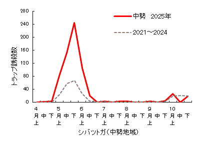 シバツトガ用フェロモン剤の販売中止に伴い、2025年はオオタバコガ用のフェロモントラップに誘殺されたシバツトガ数を記載しています。